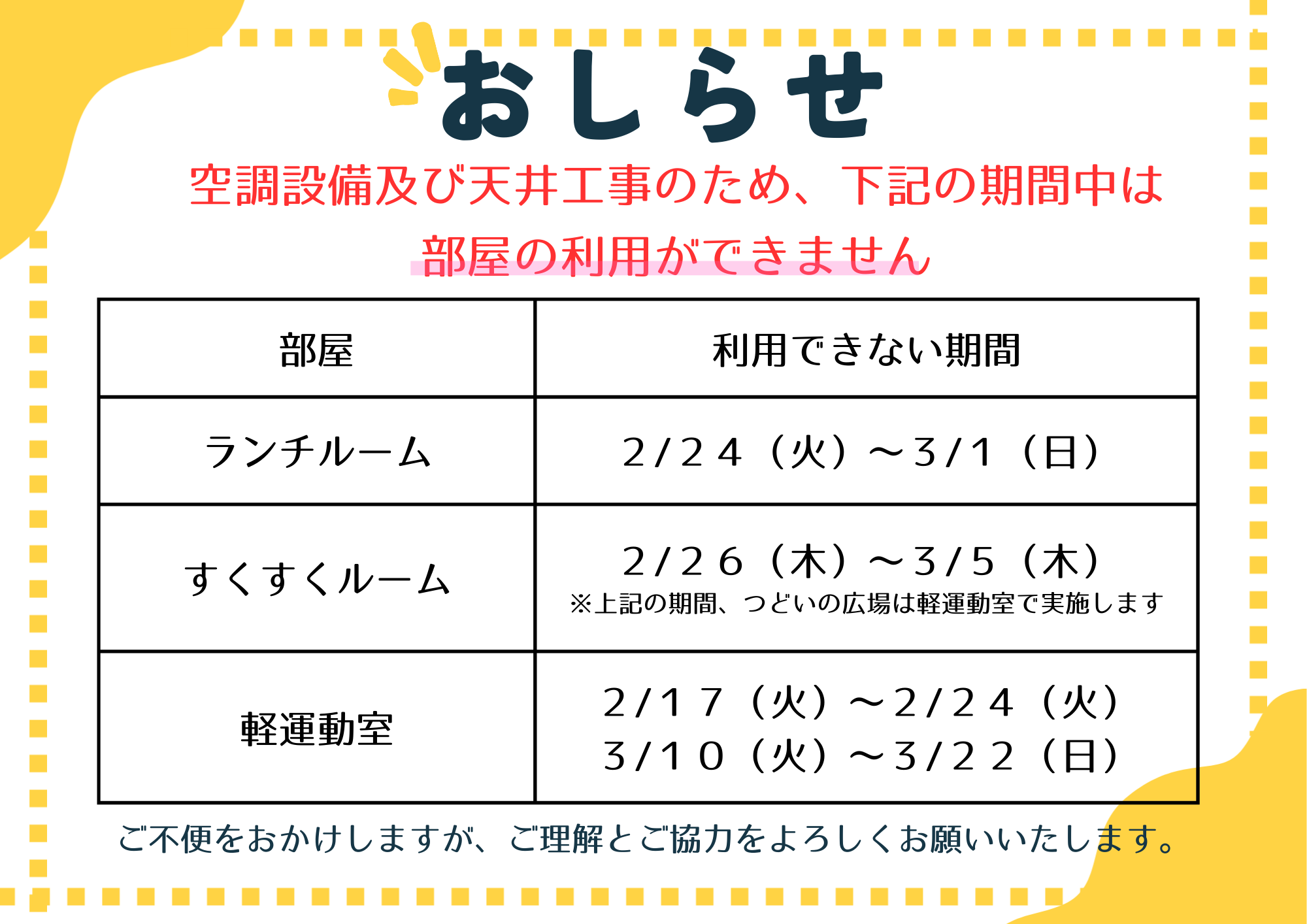 空調設備及び天井工事に伴う各部屋の利用制限について