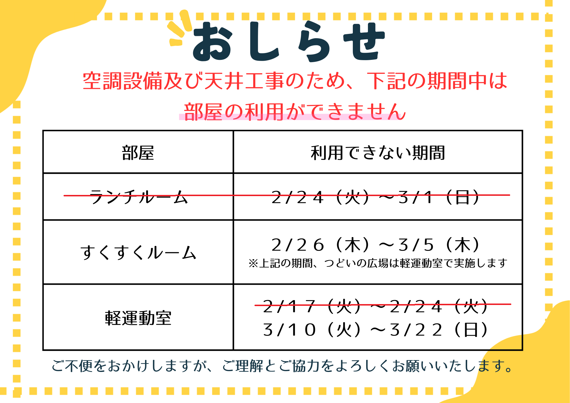 ※更新 空調設備及び天井工事に伴う各部屋の利用制限について