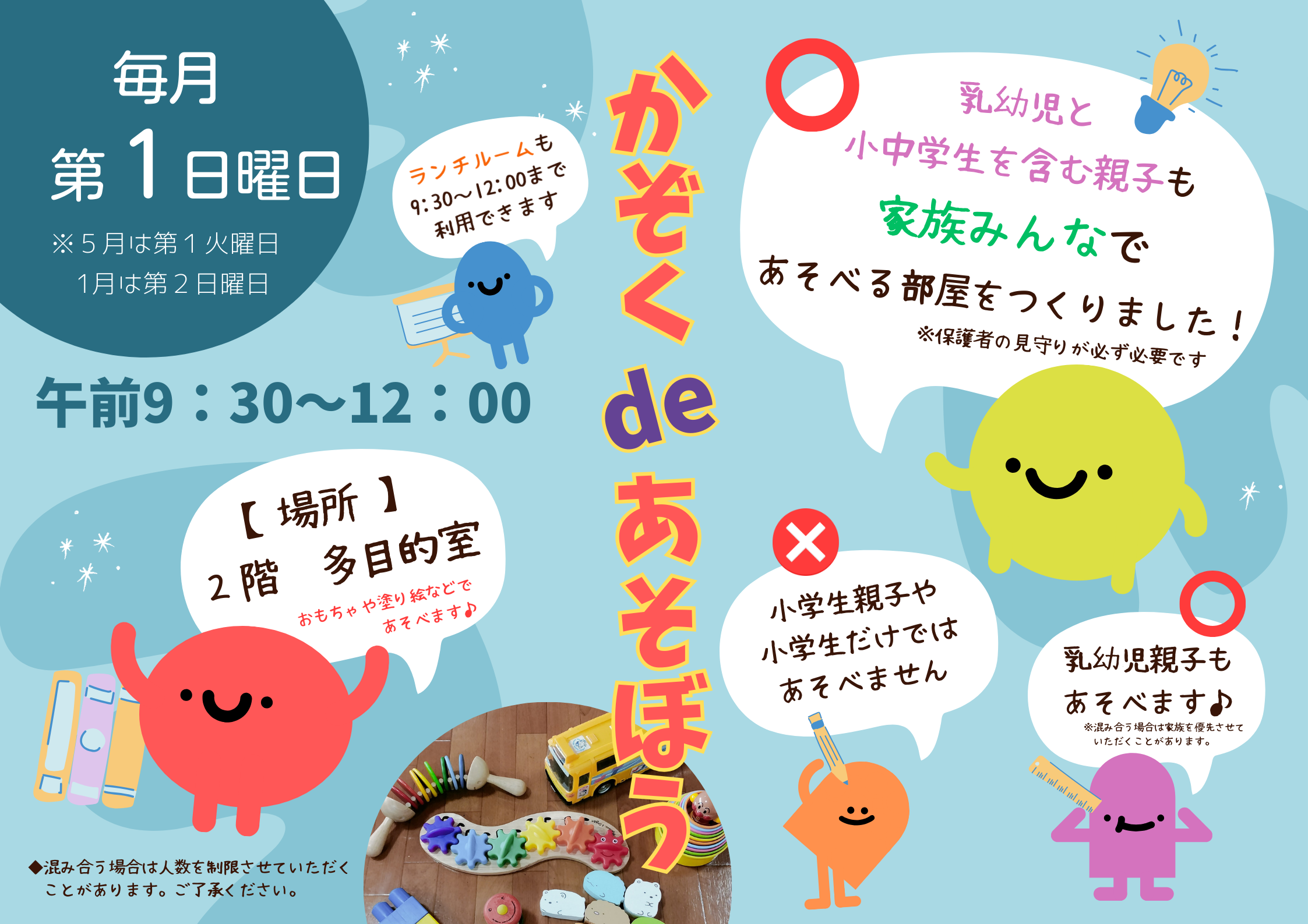 ・乳幼児と小中学生を含む親子(家族) ・乳幼児とその保護者 ※小学生親子や小学生のみの利用はできません |