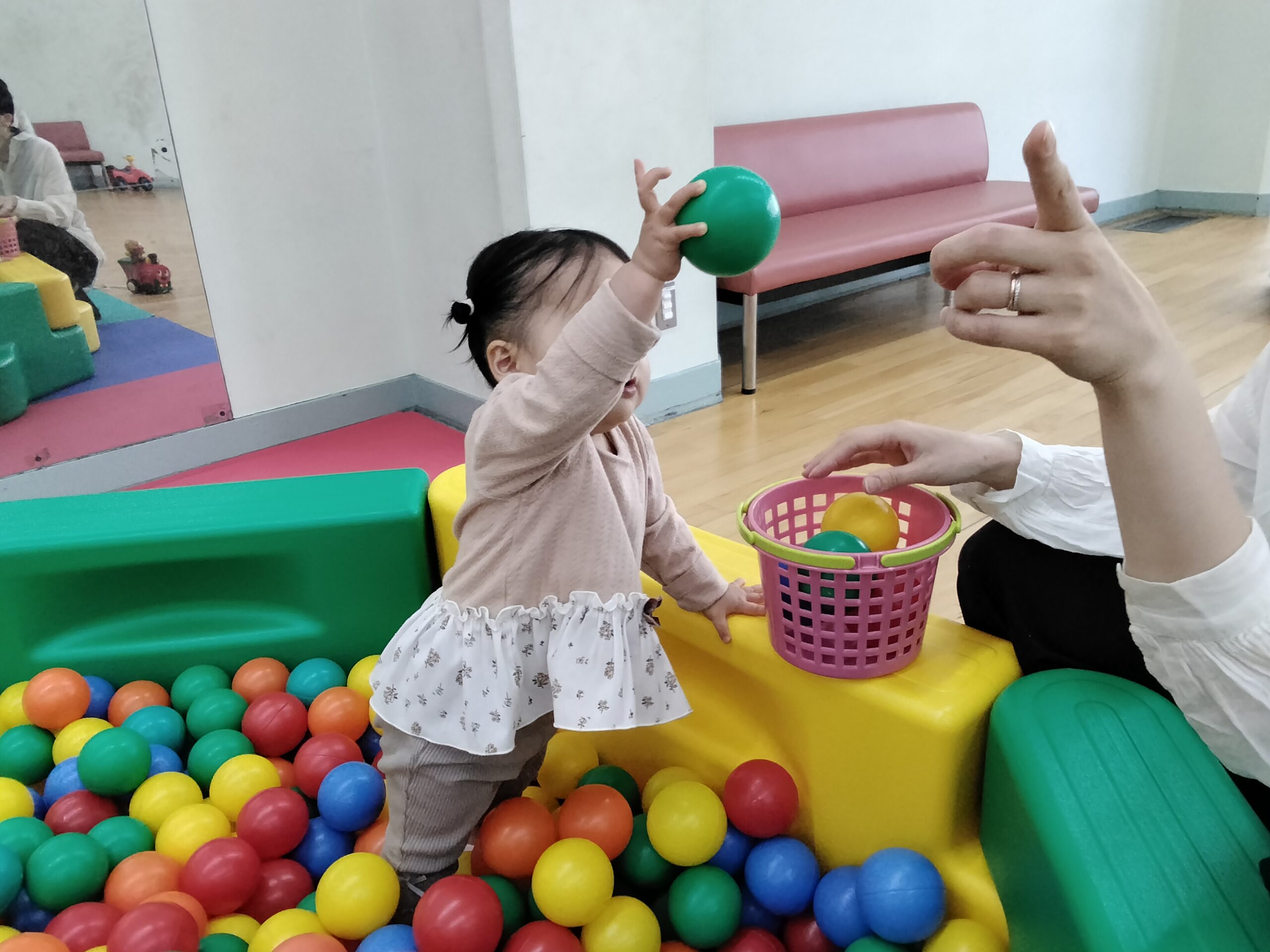 月に一度のボールプール!ボールのプールにダ~イブ!!ボールの中で泳いだり、跳ねたり、投げたり、運んだり…いろいろな遊び方で楽しまれていました。