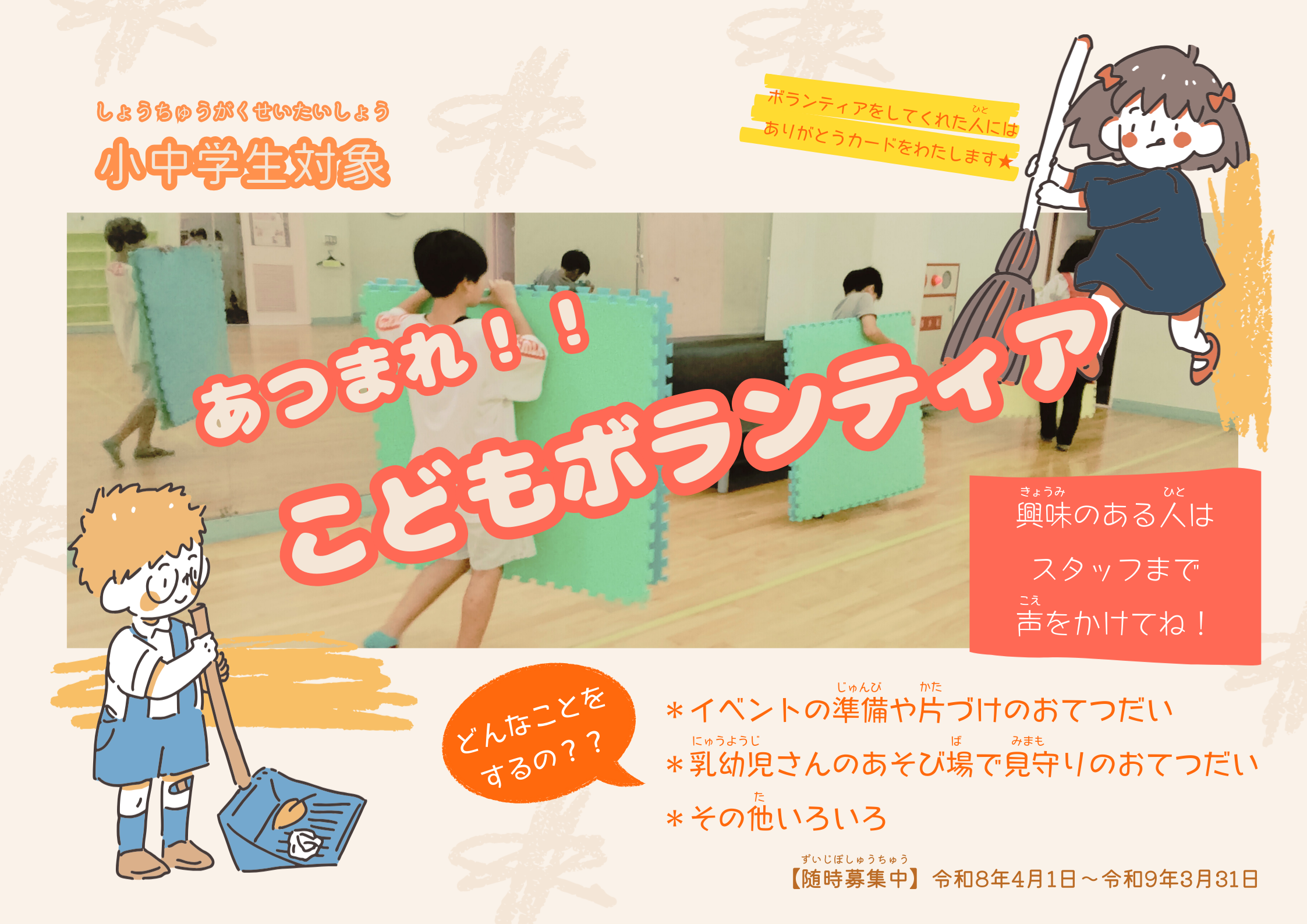 ボランティアは随時募集しているので、興味のある人はスタッフに声をかけてね。